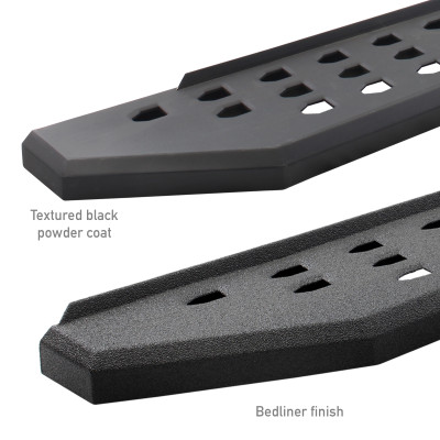 The legendary RB Series of cab length running boards from Go Rhino will make your truck, Jeep or SUV stand apart from the crowd. With an aggressive, yet stylish appearance, these bolt-on side steps take their visual inspiration from the Ford Raptor but are made for more than just looks. The RB10 running boards features a generous step area with Raptor-style louvers for maximum traction when entering and exiting your vehicle. The corrosion-resistant 16-gauge zinc coated steel steps are mounted high and tight, giving them plenty of clearance for off-road adventures, and are strong enough to support hundreds of pounds of weight. The welded, boxed end design is offered in two finishes: textured black powder coat or rugged, bedliner coating. RB10 Running Boards come with a Limited Lifetime warranty on materials and construction and a 5 year warranty on the Bedliner Finish.